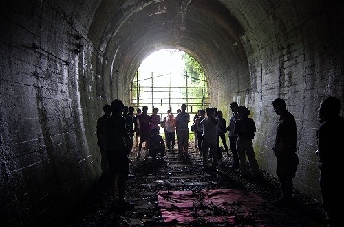 一方、熊ヶ畑トンネルは、廃線となった旧国鉄上山田線の一部で、線形は一直線、その長さ1.7キロメートルという個性的なトンネルです。普段は入れないトンネルの入り口に、少しだけ入ることができ、「ワインの貯蔵に使ったら!」とか「映画祭のイベントができる!」など、今後の活用アイデアを出し合いながら、視察を行いました。
