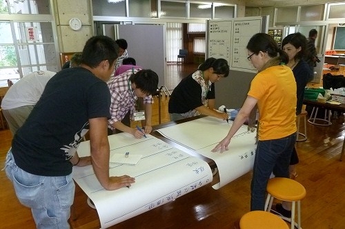 そして、場所をホールに移し、4つのグループに分かれてワークショップです。講義をもとに、シートの項目にしたがって、話し合いながら埋めていきます。グループごとに、フォーカスする農村資源をひとつ決め、資源のSWOT分析や多様な資源価値の検討など、作業を通じて、資源をどんどん掘り下げていきます。