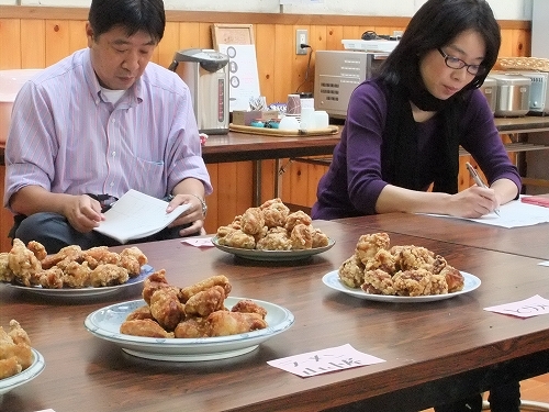 川崎町の伝説のから揚げ店、その元となったおばあちゃんの話、各お店の特徴などをグループ毎に発表し、待ちに待った試食。
